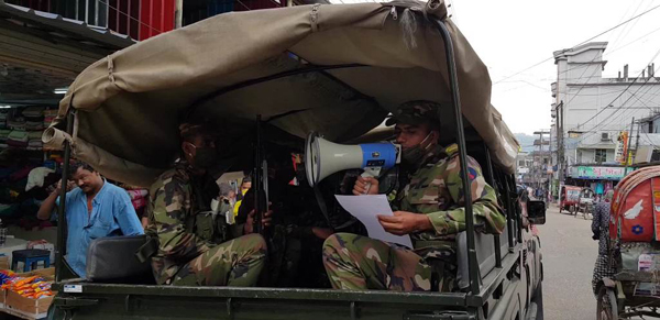 বান্দরবানঃ-করোনাভাইরাস পরিস্থিতি মোকাবেলায় সারাদেশের মত বান্দরবানেও সেনা মোতায়েন হয়েছে। দুপুর থেকে শহরে বিভিন্ন মোড়ে মোড়ে টহল দিতে দেখা যায় সেনা সদস্যদের। টহলরত সেনা সদস্যরা সামাজিক দূরত্ব বজায় রাখতে ও জরুরী প্রয়োজন ছাড়া কাউকে ঘর থেকে বের না হতে সচেতনতামূলক মাইকিং করছে।