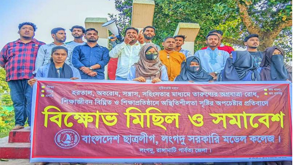 শান্তিপূর্ণ দেশে অরাজকতা সৃষ্টির লক্ষ্যে হরতাল, অবরোধ, সন্ত্রাস, সহিংসতার মাধ্যমে তারুণ্যের অগ্রযাত্রা রোধ, শিক্ষা জীবন বিঘ্নিত ও শিক্ষা প্রতিষ্ঠানে অস্থিতিশীলতা সৃষ্টির অপচেষ্টায় বিএনপি-জামায়াতের সন্ত্রাস ও নৈরাজ্যের প্রতিবাদে বাংলাদেশ ছাত্রলীগ কেন্দ্রীয় সংসদের নির্দেশনায় রাঙ্গামাটির লংগদু সরকারি মডেল কলেজ শাখা ছাত্রলীগের আয়োজনে বিক্ষোভ মিছিল ও সমাবেশ অনুষ্ঠিত হয়েছে।