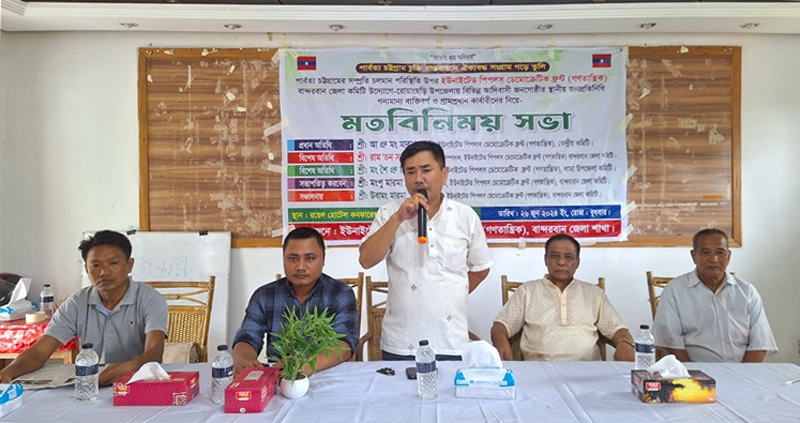 পার্বত্য চট্টগ্রামে চুক্তি বাস্তবায়নে ঐক্য সংগ্রাম গড়ে তুলি এই প্রতিপাদ্যকে সামনে রেখে বান্দরবানে পার্বত্য চট্টগ্রামের সম্প্রতি চলমান পরিস্থিতির উপর ইউনাইটেড পিপলস ডেমোক্রেটিক ফ্রন্ট (ইউপিডিএফ গণতান্ত্রিক) বান্দরবান জেলা কমিটির উদ্যোগে রোয়াংছড়ি উপজেলার বিভিন্ন জনগোষ্ঠীর স্থানীয় জনপ্রতিনিধি গণ্যমান্য ব্যক্তিবর্গ ও গ্রাম প্রধান কারবারিদের নিয়ে মত বিনিময় সভা অনুষ্ঠিত হয়েছে।