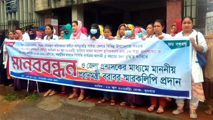 খাগড়াছড়িতে পরিবার পরিকল্পনা অধিদপ্তরের অধীনে কর্মরত পেইড পিয়ার ভলান্টিয়ার কার্যক্রম বন্ধের আদেশ স্থগিত চেয়ে মানববন্ধন করেছে ভুক্তভোগীরা। এসময় তারা ৫ম স্বাস্থ্য জনসংখ্যা ও পুষ্টি সেক্টর কর্মসূচি ২০২৪/৩০ এ তাদের অন্তর্ভুক্তির দাবিও জানান।