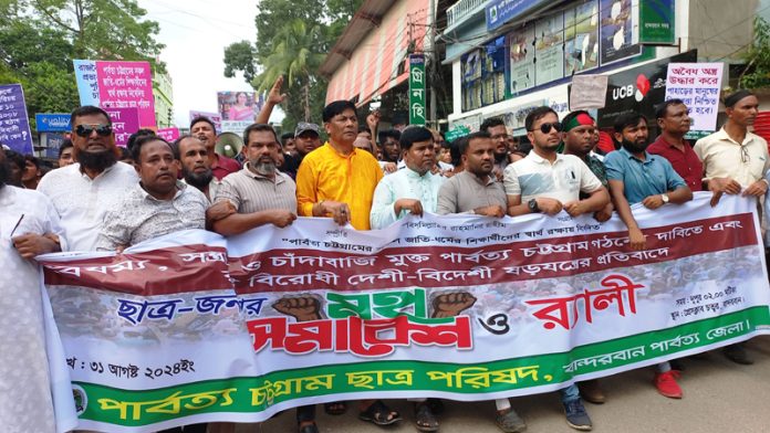 এর আগে বান্দরবান পৌরসভার সামনে থেকে হাজার হাজার ছাত্র-জনতা বিক্ষোভ মিছিল নিয়ে শহরের প্রধান প্রদান সড়ক প্রদক্ষিন করে মহাসমাবেশে মিলিত হয়।