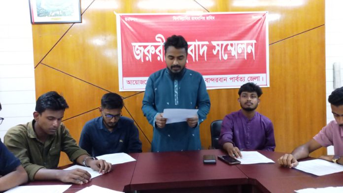শনিবার (৯ নভেম্বর) দুপুরে বান্দরবান সচেতন ছাত্র সমাজের ব্যানারে বান্দরবান প্রেসক্লাবের হলরুমে এই সংবাদ সম্মেলন অনুষ্ঠিত হয়।