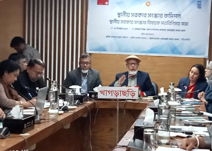 খাগড়াছড়িতে স্হানীয় সরকার সংস্কার কমিশনের সাথে অংশী জনের সাথে একমত বিনিময় সভা সকাল ১১টায় জেলা প্রশাসকের সম্মেলন কক্ষে অনুষ্ঠিত হয়। এতে সভাপতিত্ব করেন খাগড়াছড়ি জেলা প্রশাসক মোঃ শহীদুজ্জামান। প্রধান অতিথির বক্তব্য রাখেন সংস্কার কমিশনের চেয়ারম্যান ড:তোফায়েল আহমেদ। তিনি বলেন, পাহাড়ের স্থানীয় সরকার সংস্থাগুলোতে প্রথাগত ব্যবস্থা বলবৎ থাকায় এখানে বিভিন্ন সমস্যা রয়েছে। এখানে বহুমুখী উন্নয়ন সংস্থা রয়েছে। তবে উন্নয়ন কাজে সমন্বয় নেই। বহুলাংশে দুর্নীতি অনিয়ম সংগঠিত হচ্ছে। স্বচ্ছতা জবাবদিহীতা নেই। পাহাড়ি অঞ্চলের স্থানীয় সরকার প্রশাসনে একটা শৃঙ্খলা আনার জন্য আমরা কাজ করছি। এসব সমস্যা বাস্তবতার নিরিখে চিহ্নিত করে আমাদেরকে সমাধানের পথে এগোতে হবে।