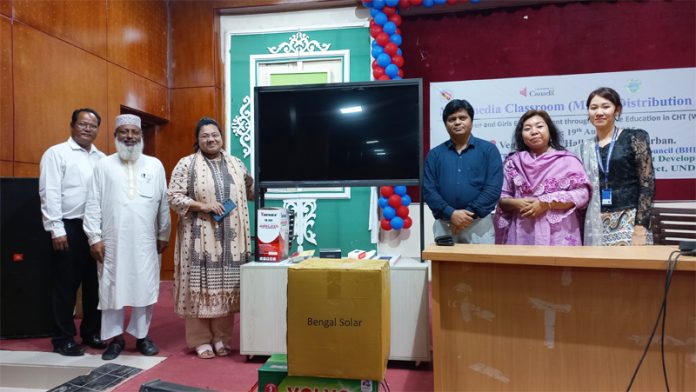আয়োজকেরা জানান, বান্দরবানে মানসম্পন্ন শিক্ষার মান উন্নয়নে ইউএনডিপি এর অন্তর্ভুক্তিমূলক শিক্ষার মাধ্যমে নারী ও মেয়েদের ক্ষমতায়ন প্রকল্পের আওতায় বান্দরবান জেলার ১৯০টি শিক্ষা প্রতিষ্ঠানে মাল্টিমিডিয়া-ক্লাসরুম (এমএমসি) পরিচালনার জন্য প্রথম পর্যায়ে ৫০টি শিক্ষা প্রতিষ্ঠানে একটি টেলিভিশন, একটি টেবিল, একটি কিবোর্ড-মাউস, মাল্টিপ্লাস, একটি সোলার প্যানেল ও ব্যাটারিসহ বিভিন্ন শিক্ষা উপকরণ বিতরণ করা হয়েছে এবং পর্যায়ক্রমে আরো ১৪০টি শিক্ষা প্রতিষ্টানে এই মাল্টিমিডিয়া উপকরন বিতরন করা হবে।