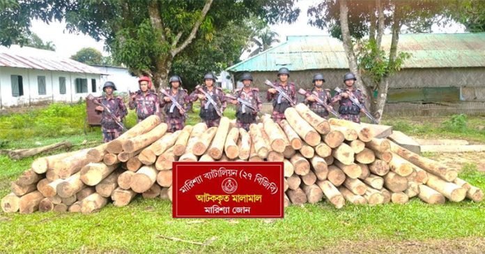 বাঘাইছড়িতে গোপন তথ্যের ভিত্তিতে বিপুল পরিমাণ অবৈধ সেগুন গোল কাঠ জব্দ করে ২৭ বিজিবি মারিশ্যা জোন।
