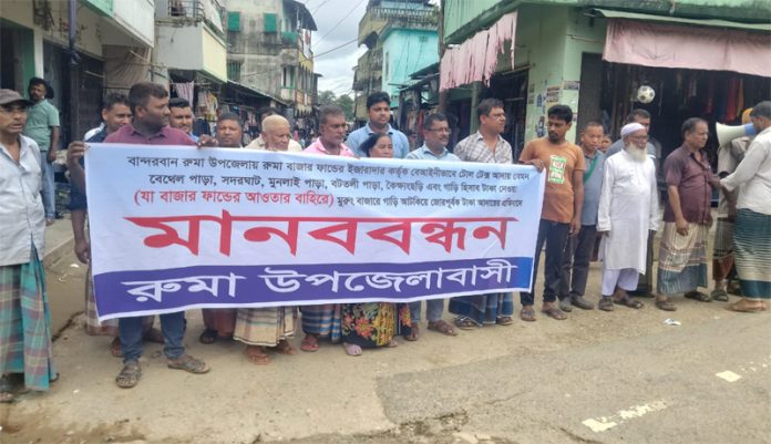বান্দরবানে রুমা বাজারসহ বিভিন্ন পয়েন্টে টোল-ট্যাক্স (হাসিল) আদায়ে অনিয়ম ও হয়রানির প্রতিবাদে মানববন্ধন ও বিক্ষোভ সমাবেশ হয়েছে। সোমবার (১৫ সেপ্টম্বর) সকাল ১০টায় রুমা বাজারে এই মানববন্ধন ও সমাবেশ অনুষ্ঠিত হয়েছে।