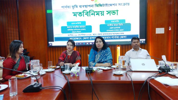 পার্বত্য ভূমি ব্যবস্থাপনা ডিজিটাইজেশনে বান্দরবানে এক মতবিনিময় সভা অনুষ্ঠিত হয়েছে। রবিবার (২৮ সেপ্টেম্বর) সকালে বান্দরবান জেলা প্রশাসনের আয়োজনে জেলা প্রশাসকের সম্মেলন কক্ষে জেলা প্রশাসক শামীম আরা রিনির সভাপতিত্বে এসময় প্রধান অতিথি হিসেবে উপস্থিত থেকে চট্টগ্রাম বিভাগের অতিরিক্ত কমিশনার (রাজস্ব) শারমিন জাহান পার্বত্য এলাকার ভূমি ব্যবস্থাপনাকে ডিজিটাইজেশন করতে উপস্থিত বিভিন্ন অতিথিদের কাছ থেকে পরামর্শ গ্রহণ করেন এবং ভূমি ব্যবস্থাপনা ডিজিটাইজেশনে কি কি সুবিধা বাড়বে সেটি নিয়ে আলোকপাত করেন।